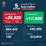 タイ保健省は2021年8月5日(木)朝、1日で確認された新型コロナウイルス陽性者が20,920人だっ[...]