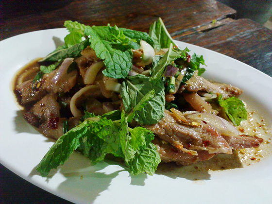 ナムトックムーとは豚肉のハーブ和え。辛い。イサーン料理の代表格でカオニャオ(蒸したもち米)と一緒に食べる。