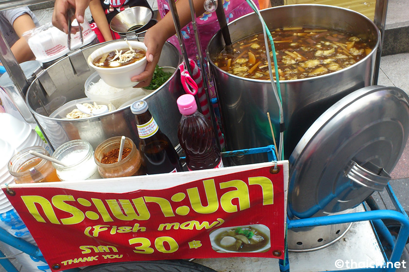 クラポプラーナムデーンは魚の浮袋のあんかけ赤色スープ。中に麺が入っている場合もあり。”クラポプラー(魚の浮袋)”の発音は”ガポパー”に近い。