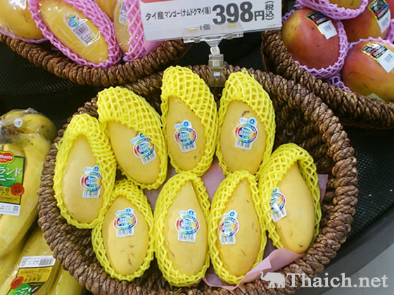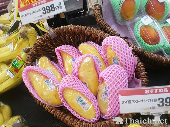 日本のスーパーマーケットで売られているタイのマンゴー(ナムドクマイ種&マハチャノ種)。 一つ398円とは意外に安価な印象ですね。