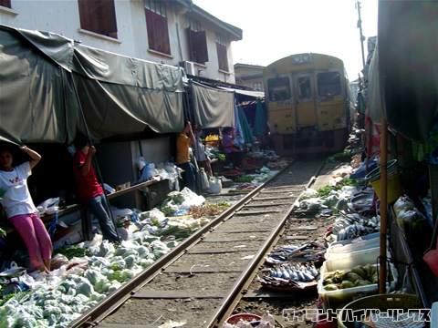 線路の上の市場として有名なメークロン線です。 電車が近づくと大急ぎで商品を脇に寄せる姿は一見の価値があります。 ダムヌンサドゥアック水上マーケットに向かう途中に電車の時間が合えば見ることが出来るようです。