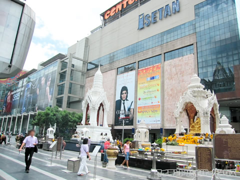 敬虔な仏教徒の多いタイではいたるところに祠がありますが、セントラルワールド前の祠も多くの人が参拝する場所です。 右側の祠に移っている金色の像はヒンドゥー教の神様「ガネーシャ」です。