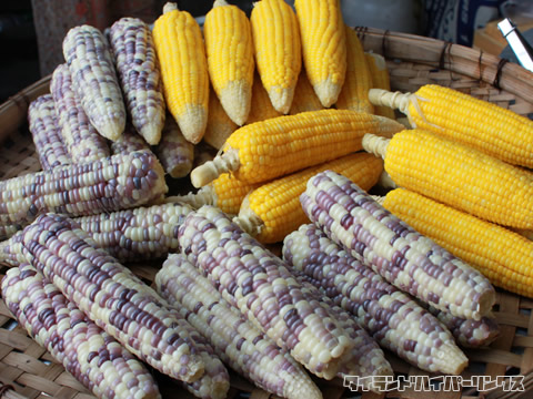 お馴染みの黄色いトウモロコシの他に白と紫色のトウモロコシも。