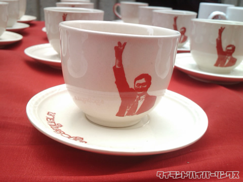 反政府のタクシン派組織「赤服(スアデーン)」の露店で売られているタクシン・チナワット元首相のティーカップです。 この他にもマグカップやコーヒカップが売られています。