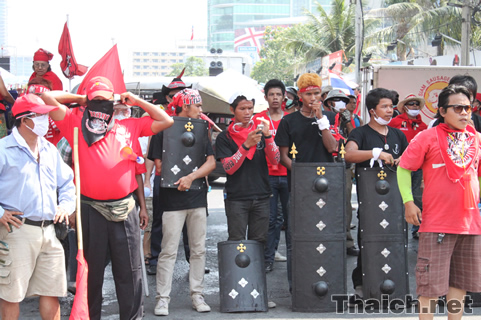 ラチャプラソン交差点でデモ活動を続けるタクシン元首相の支持団体「反独裁民主統一戦線(UDD)」の赤服デモですが、警察や軍による放水やガスによる強制排除の動きを察して道路を塞いでいます。
