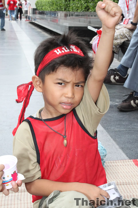 打倒アピシット政権に向けて拳を振り上げる子供。