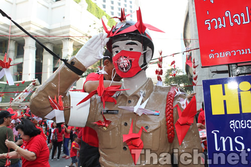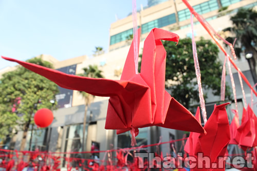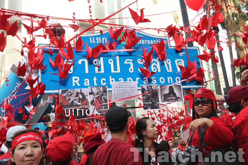 これは2010年の3月から5月にかけて行われたデモによる被害者の追悼式で、赤い折り鶴が飾り付けられています。<br />