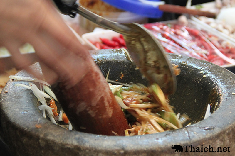 千切りにされた青いパパイヤを唐辛子、ニンニク、ライム、ナンプラーなどで和えたタイ人のソウルフード・ソムタム(パパイヤサラダ)。鉢の中でポクポク叩いてしっかり和えて、おいしいソムタムの出来上がりです。