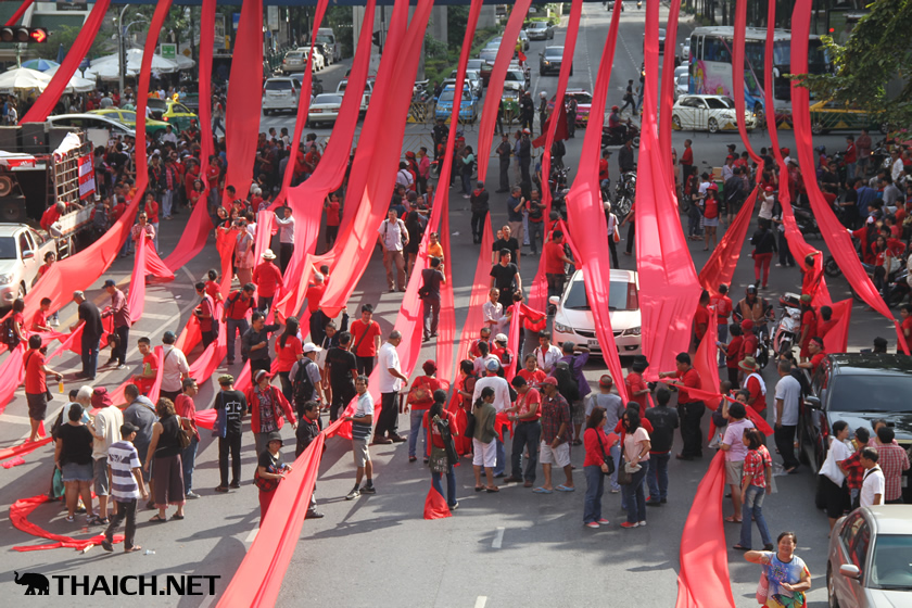 一時ラチャダムヌン通りを封鎖して、2つの歩道橋をつなげる真っ赤な幕を掲げました。