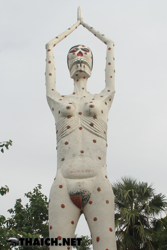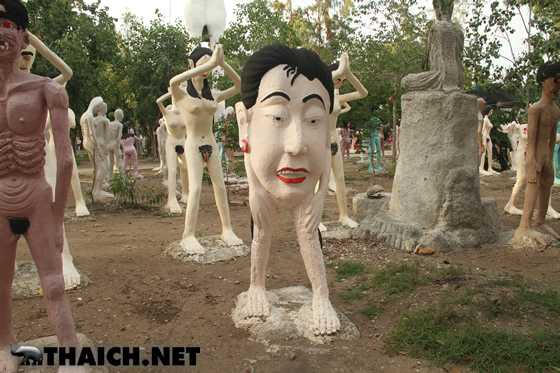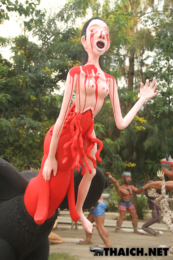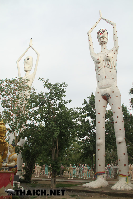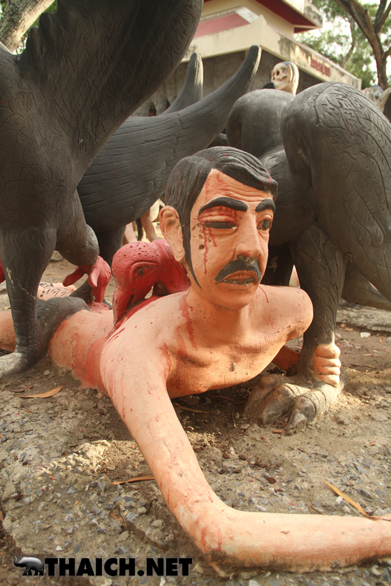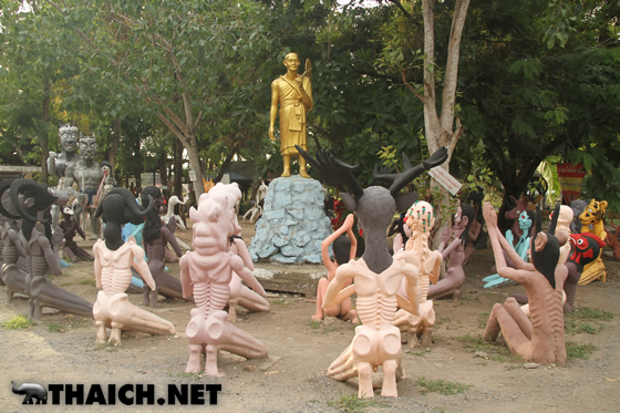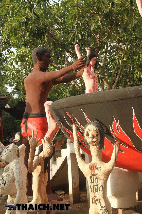 人間が悪行を働くと死んだ後にこのような地獄へ落ちる、というものを形にしたのが地獄寺です。タイ各地に同様のお寺があり、沢山の子ども達も訪れるなど観光スポットになっています。今回はバンコクから北西へ向かい約2時間、スパンブリー県にある地獄寺ワット・パイローンウア(วัดไผ่โรงวัว)へ行ってみました。