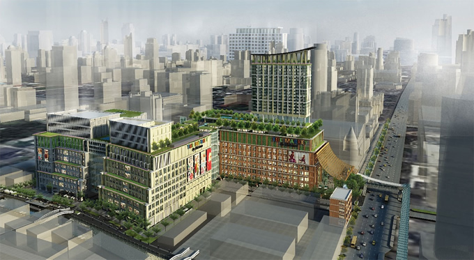 地下階にはスーパーマーケットと駐車場、G階から3階はショッピングエリア、4階と5階は2000席のフードコートとレストラン、6階から8階は駐車場、9階から12階はオフィス他。