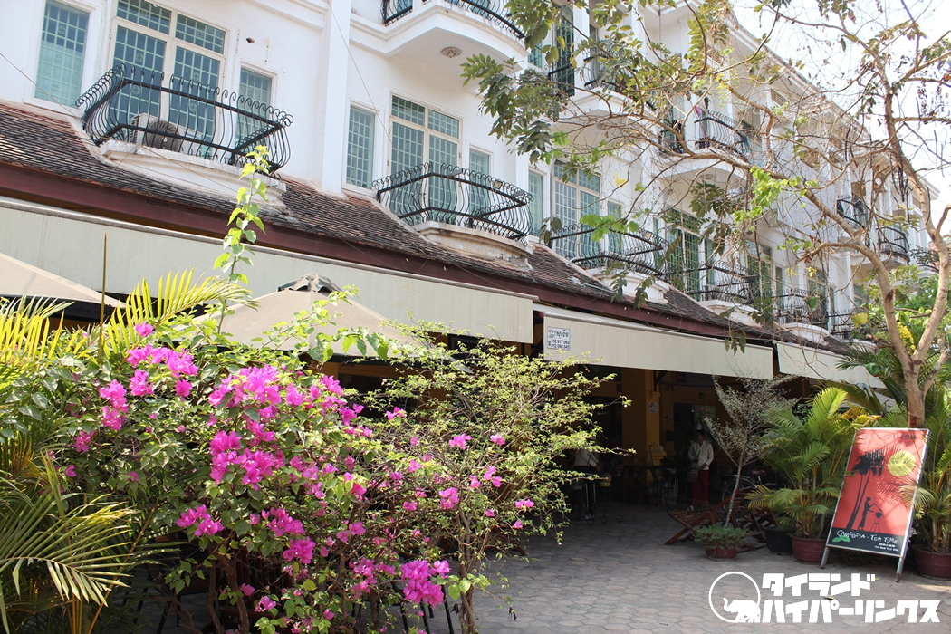『カンボジア・ティー・タイム』の場所はアンコール遺跡へ向かうシャルル・ド・ゴールの途中、ル・メリディアン・ホテルの隣にあります。観光の帰りに立ち寄るのにちょうど良いロケーションです。