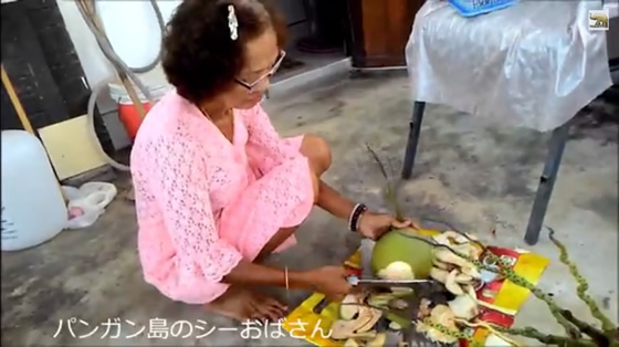 タイ南部のパンガン島で暮らすパーシー(シーおばさん)が、島のココナッツ畑で買ってきた1つ10バーツのココナッツから、甘くておいしいココナッツジュースを取り出します。