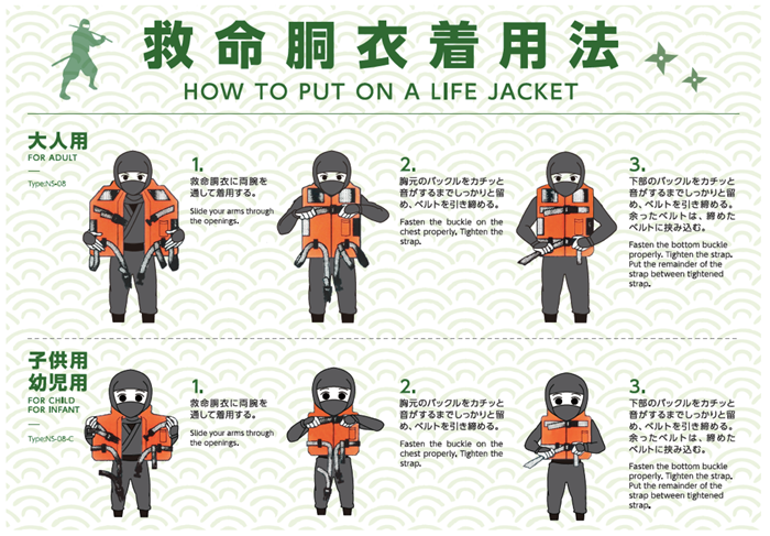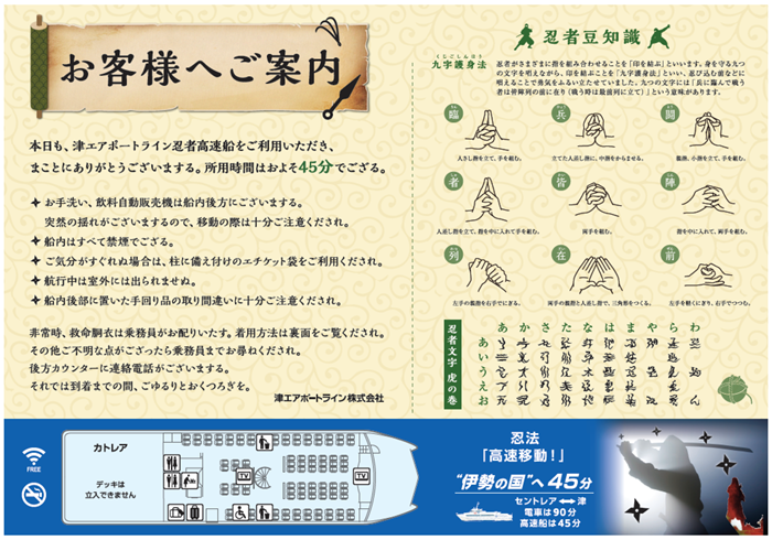 本キャンペーンでは、高速船の船内やターミナルに忍者装飾や忍者文字の装飾を施すなどの演出がされるほか、各種案内に忍者のイラストや忍者言葉を使用するなどの演出もされるとのことです。